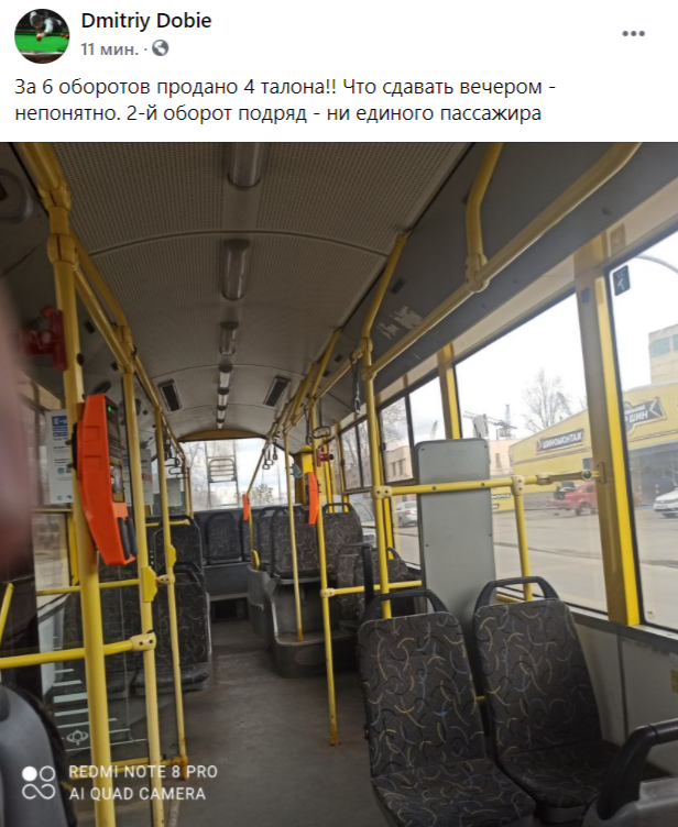 "За 6 оборотов продано 4 талона!! Что сдавать вечером - непонятно. 2-й оборот подряд - ни единого пассажира", - поделился кондуктор Дмитрий.