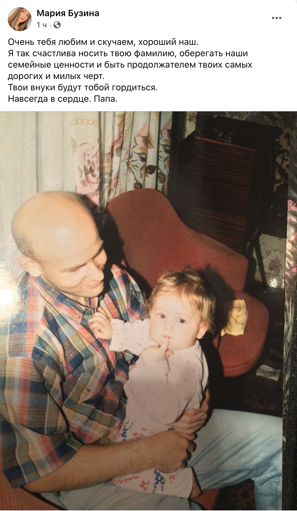"Очень тебя любим и скучаем, хороший наш. Я так счастлива носить твою фамилию, оберегать наши семейные ценности и быть продолжателем твоих самых дорогих и милых черт. Твои внуки будут тобой гордиться. Навсегда в сердце. Папа", - написала на своей странице в Фейсбуке дочь Олеся Бузины Мария.