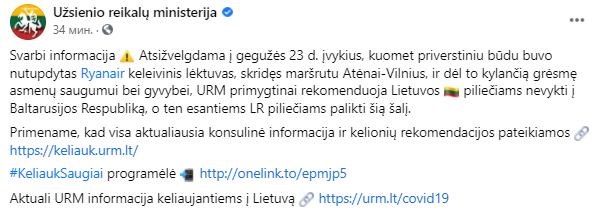 Гражданам Литвы настоятельно порекомендовали не посещать Беларусь, а находящимся сейчас на ее территории - выехать. МИД Литвы связывает свои рекомендации с инцидентом, связанным с вынужденной посадкой пассажирского самолета авиакомпании Ryanair, летевшего из Афин в Вильнюс, и задержании белорусского оппозиционера и создателя информационного портала Nexta Романа Протасевича. Об этом сообщается на странице МИД Литвы в соцсети.