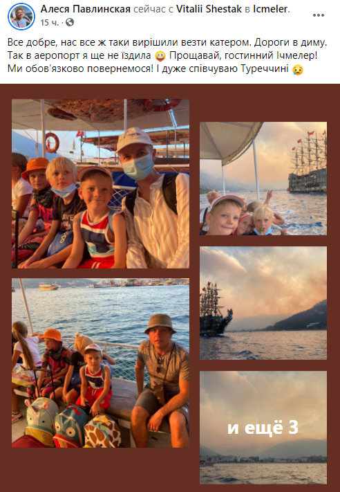Украинка Алеся Павлинская, семья которой отдыхала в Ичмелере (курорт вблизи города Мармарис), рассказала в Facebook, что в аэропорт им пришлось плыть на катере, так как дороги в дыму. Перед этим она писала, что "дорога на Мармарис горит, а по ней полтора часа ехать в аэропорт".