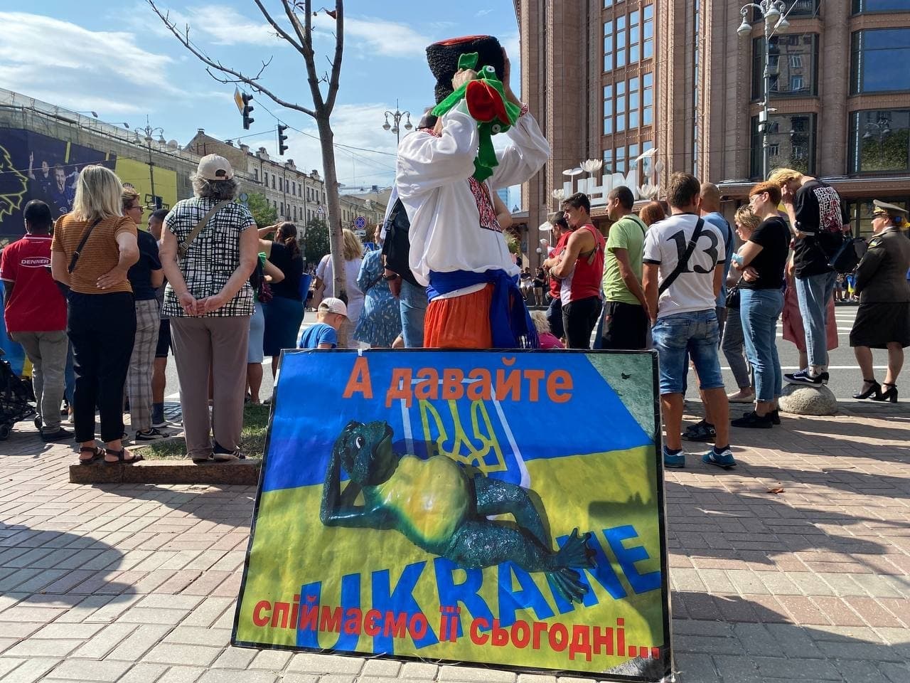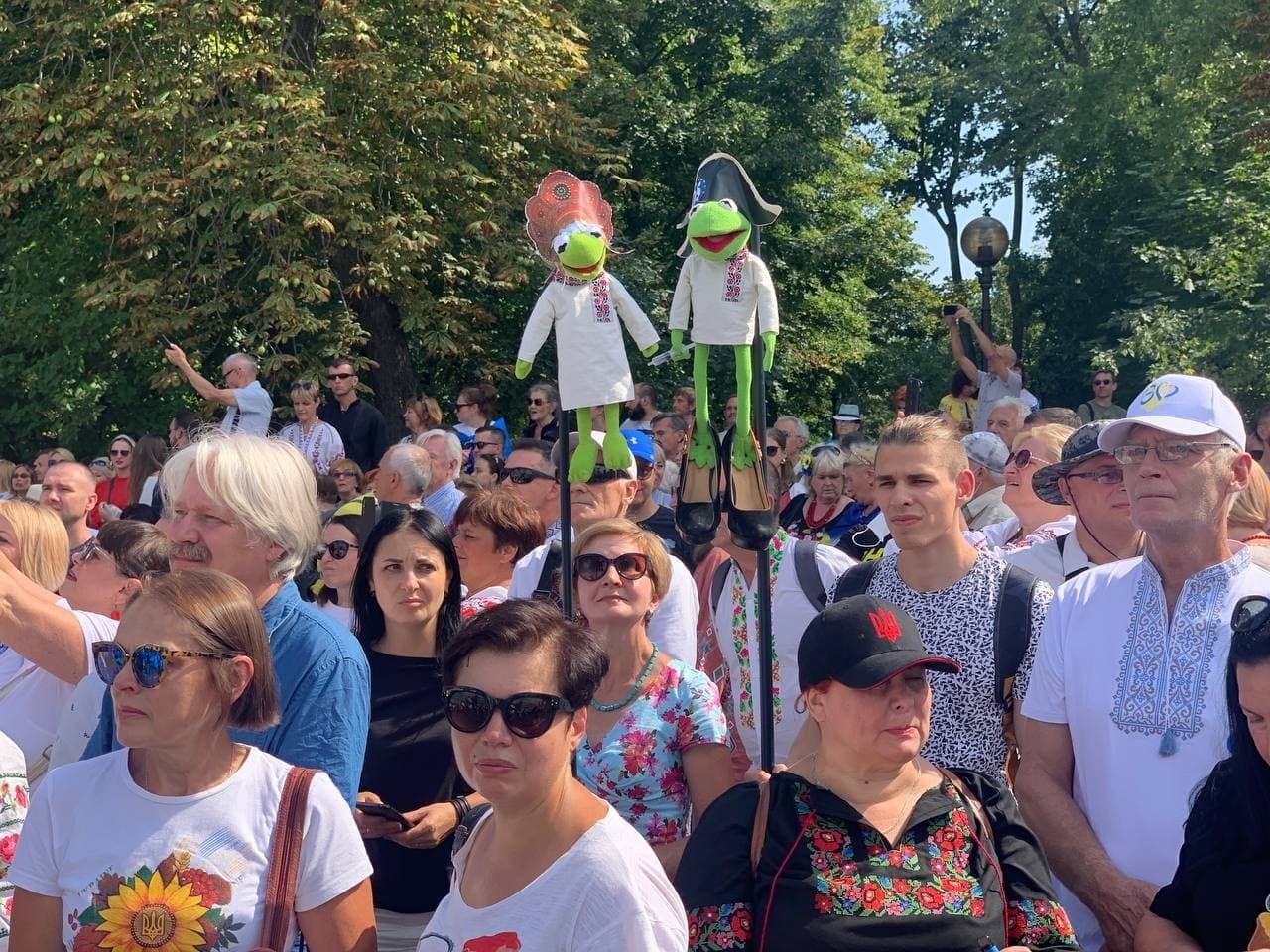 Во вторник, 24 августа, участники "Марша защитников Украины" принесли куклы и картинки с лягушками. По их словам, эти атрибуты символизируют президента Владимира Зеленского и его супругу Елену.