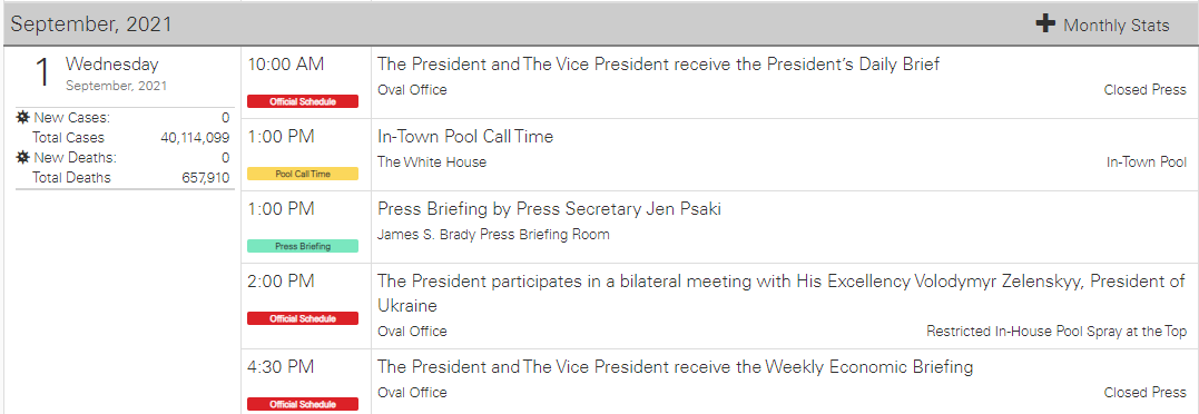 Также указано, что на двустороннюю встречу глав государств отводится 2,5 часа, поскольку следующее мероприятие Байдена запланировано уже на 16:30. Совместный брифинг президентов США и Украины в расписании не указан.