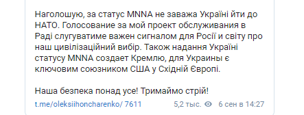 "И голосование за мой проект обращения в Раде будет служить важным сигналом для России и мира о нашем цивилизационном выборе. Также предоставление Украине статуса MNNA продемонстрирует Кремлю, что Украина является ключевым союзником США в Восточной Европе", - говорится в сообщении Гончаренко.