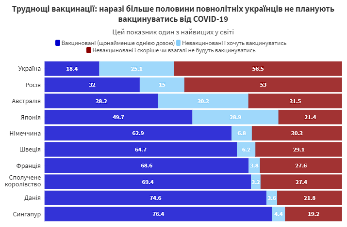 В начале новой волны заболеваемости COVID-19 уровень вакцинации в Украине является крайне низким по сравнению с европейскими странами, говорится в исследовании. Данные опроса показывают долю вакцинированных от COVID-19 человек, почти идентичную с официальной статистикой, и составляют около 18% взрослого населения страны, которое постоянно проживает в Украине.