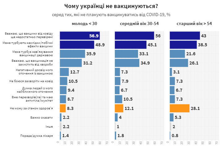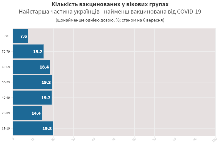 Самый низкий уровень охвата вакцинацией наблюдается среди наиболее старшей категории украинцев, которые и находятся в зоне риска. По данным официальной статистики, на 6 сентября 2021, только 7,6% лиц, старше 80 лет, получили хотя бы одну дозу вакцины. В то же время, показатель для людей в возрасте 40-59 лет приближается к 20%. Больше всего вакцинированных среди молодежи 18-19 лет - 19,8%.
