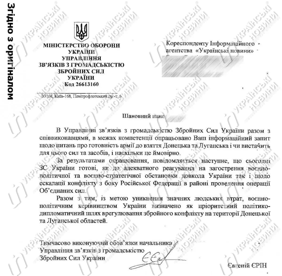"Вместе с тем, во избежание значительных человеческих потерь, военно-политическим руководством Украины определен как приоритетный политико-дипломатический путь урегулирование вооруженного конфликта на территории Донецкой и Луганской областей", - говорится в сообщении.
