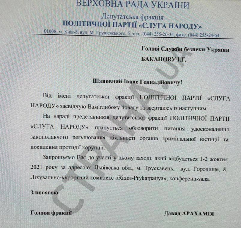 В опубликованном документе, который подписан именем главы парламентской фракции "Слуги народа" Давида Арахамии, сообщается причина, по которой на совещании хотят видеть главу СБУ.