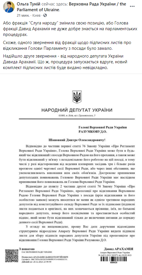 После того, как народные депутаты от "Слуги народа" выразили свое возмущение тем, что сбор голосов за отставку спикера Дмитрия Разумкова глава фракции Давид Арахамия иниицровал от имени фракции, хотя она такого решения и не принимала, глава Арахамия инициировал обращение по поводу подписных листов об отставке Разумкова лично от себя.