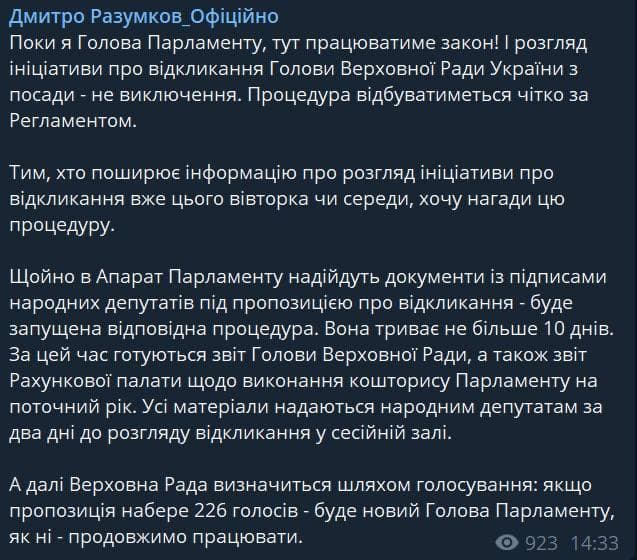 "Пока я Председатель Парламента, здесь будет работать закон! И рассмотрение инициативы об отзыве Председателя Верховной Рады Украины с должности - не исключение. Процедура будет происходить четко по регламенту", - заявил Разумков.