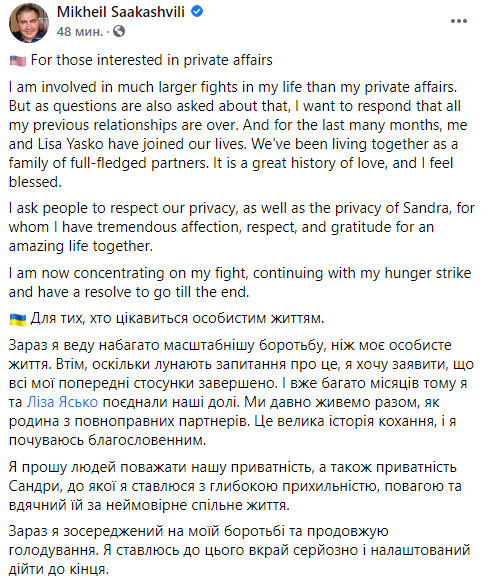 "Для тех, кто интересуется личной жизнью. Сейчас я веду гораздо более масштабную борьбу, чем моя личная жизнь. Впрочем, поскольку звучит вопрос об этом, я хочу заявить, что все мои предыдущие отношения завершены. И уже много месяцев назад я и Лиза Ясько объединили наши судьбы. Мы давно живем вместе, как семья из полноправных партнеров. Это большая история любви, и я чувствую себя благословенным", - написал Саакашвили.