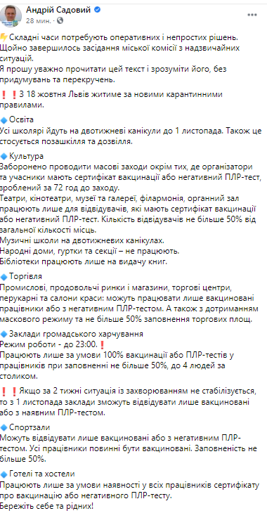 Садовый объясняет, что с 18 октября Львов будет жить по новым карантинным правилам.