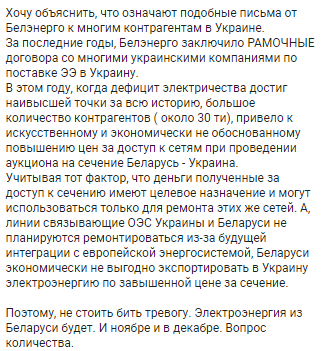 "Хочу объяснить, что означают подобные письма от "Белэнерго" ко многим контрагентам в Украине. За последние годы, Белэнерго заключило РАМОЧНЫЕ договора со многими украинскими компаниями по поставке ЭЭ в Украину.