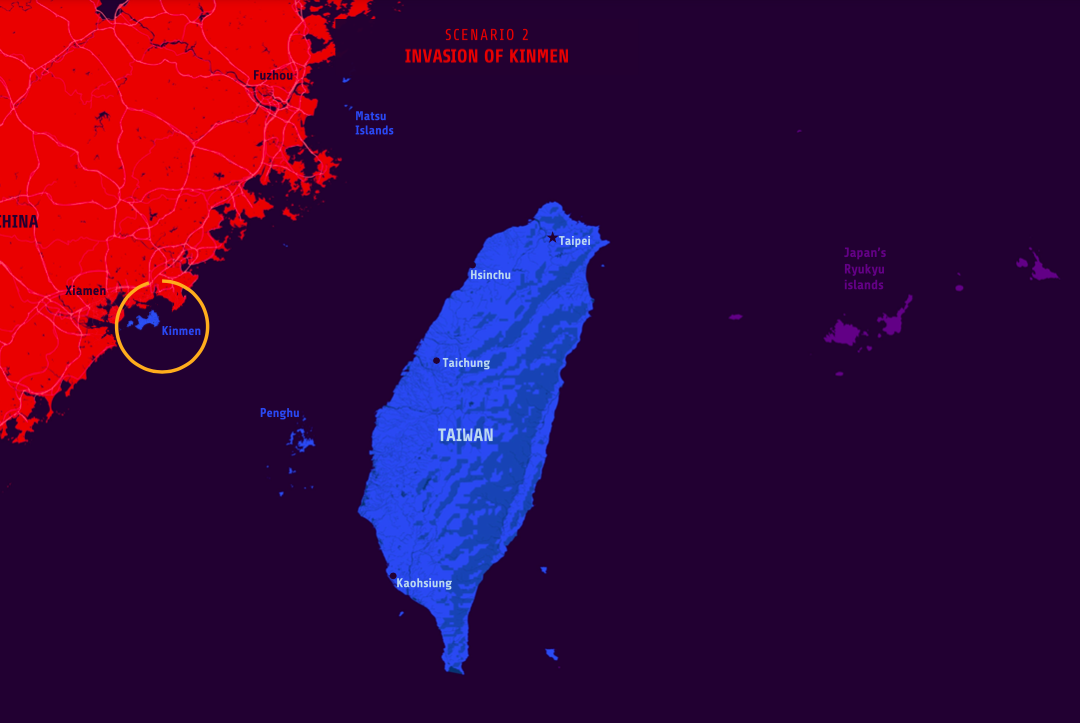 Но, прежде чем Соединенные Штаты и их союзники смогут ответить на отчаянные мольбы Тайбэя о помощи, наземные силы НОАК сокрушат защитников Цзиньмэнь. Пока американские и японские военно-морские силы движутся к Тайваньскому проливу, Пекин предупреждает, что они не должны вмешиваться. Пекин также требует, чтобы Тайбэй согласился на переговоры об объединении по формуле "Одна страна, две системы".