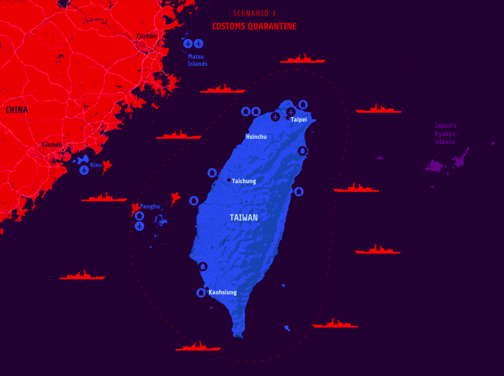 Встревоженное такими движениями, военное и политическое руководство Китая под руководством Си Цзиньпина решает ввести экстренный таможенный карантин Тайваня, чтобы заставить руководство острова согласиться на переговоры.