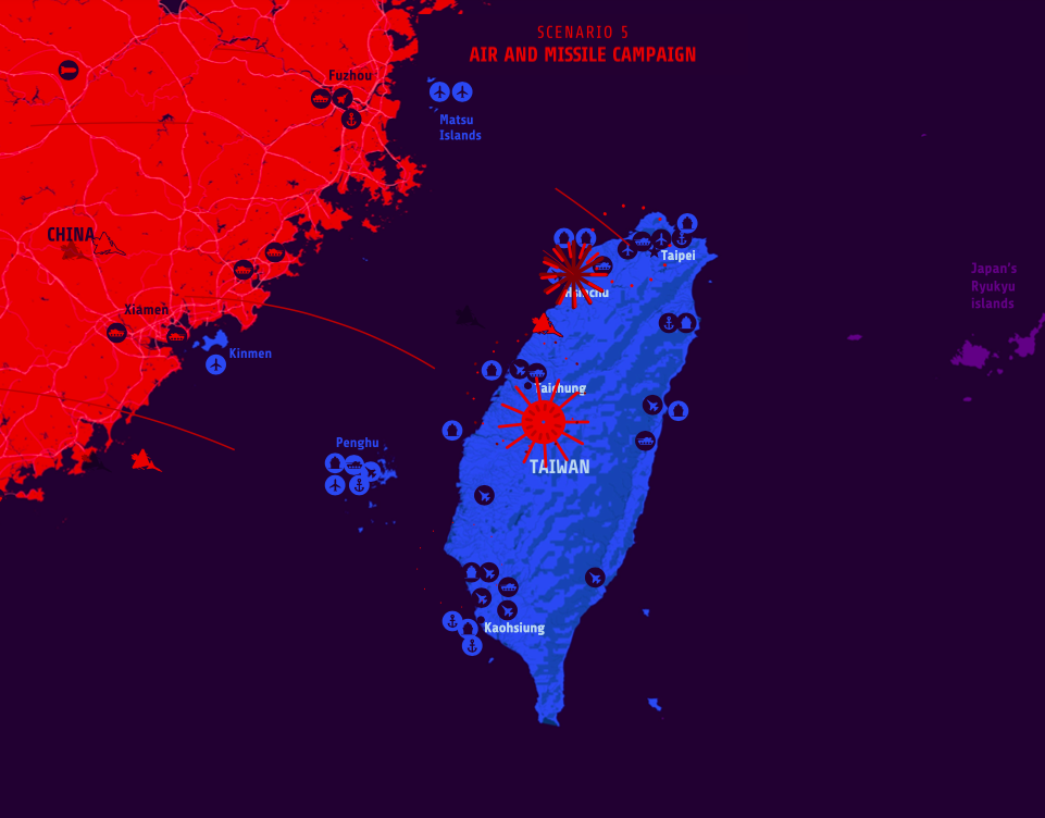 Без предупреждения НОАК осуществляют массированные воздушные, ракетные и кибератаки по ключевым военным и гражданским целям по всему Тайваню. В то же время НОАК атакует базы США в Японии и Гуаме с помощью воздушных и ракетных ударов, пытаясь парализовать американские силы и отсрочить любое вмешательство.