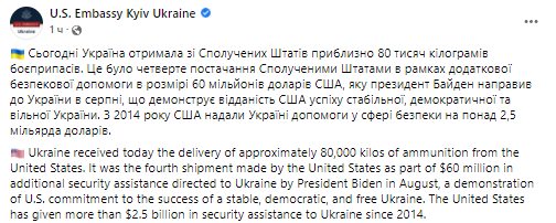 "Сегодня Украина получила из Соединенных Штатов около 80 тысяч килограммов боеприпасов. Это была четвертая поставка Соединенными Штатами в рамках дополнительной помощи в размере 60 миллионов долларов США, которую президент Байден направил в Украину в августе, что демонстрирует преданность США успеху стабильной, демократической и свободной Украины. С 2014 года США предоставили Украине помощь в сфере безопасности более чем на 2,5 миллиарда долларов", - говорится в сообщении.