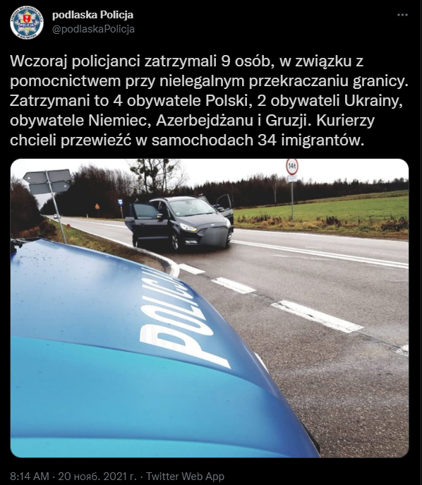 Кроме этого, за прошедшие сутки правоохранители Польши за помощь мигрантам в нелегальном пересечении границы задержали девятерых человек: четырех поляков, двое украинцев, граждан Германии, Азербайджана и Грузии. Курьеры хотели нелегально перевезти в автомобилях в общей сложности 34 мигранта.