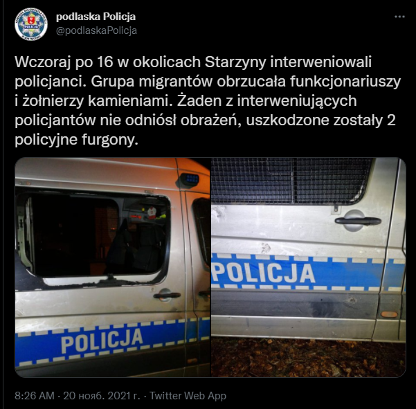 По данным полиции Подляшского воеводства, накануне около 17 часов группа мигрантов забросала камнями правоохранителей на линии границы в районе населенного пункта Стажина. В итоге были повреждены два полицейских автомобиля, но силовики не пострадали.