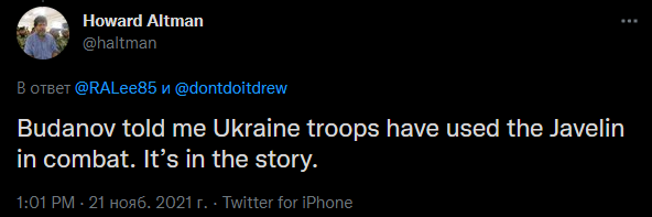 "Буданов сказал мне, что украинские войска использовали Javelin в бою. Это в истории", - сообщил журналист, называя "историей" скорее всего свою публикацию.