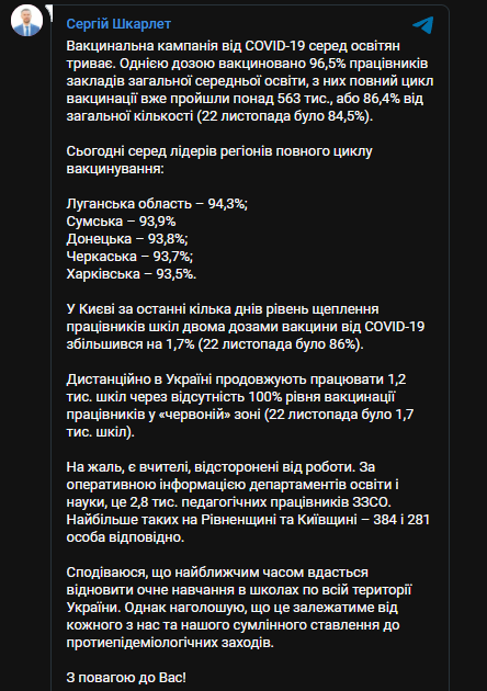 Напомним, 15 ноября Сергей Шкарлет заявлял, что в Украине полный цикл вакцинации от COVID-19 получили более 528 тыс. работников учреждений общего среднего образования - это больше 81% от общего количества. При этом одной дозой вакцины привито 95,4% работников школ.