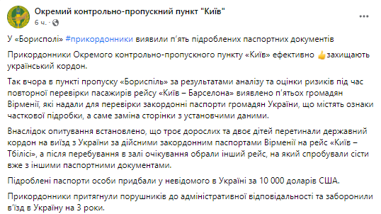 "Вчера в пункте пропуска "Борисполь" по результатам анализа и оценки рисков во время повторной проверки пассажиров рейса "Киев – Барселона" выявлены пять граждан Армении, которые предоставили для проверки загранпаспорта граждан Украины, содержащие признаки частичной подделки, а именно замена страницы с учредительными данными", - говорится в сообщении.