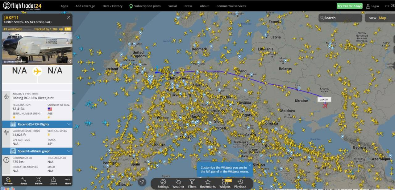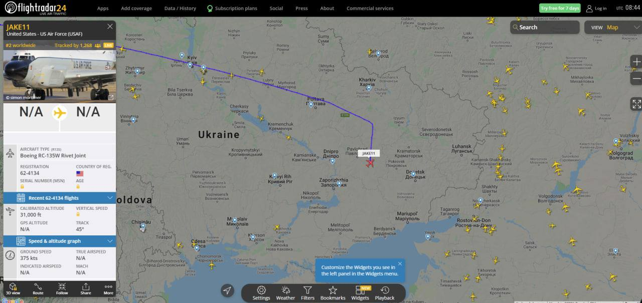 В субботу, 11 декабря, над территорией Донбасса прямо сейчас летает самолет радиоэлектронной разведки RC-135W Rivet Joint ВВС Соединенных Штатов.