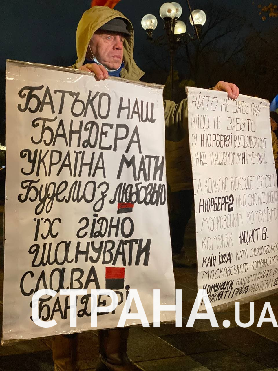 Поклонник Бандеры держит два самодельных плаката из ватмана. На одном написано четверостишие по мотивом популярной среди националистов песни "Батько наш Бандера": "Отец наш Бандера, Украина - мать, будем с любовью их достойно уважать".