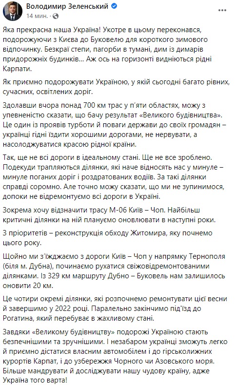По словам Зеленского, он в очередной раз убедился в том, насколько прекрасна Украина, путешествуя из Киева в Буковель, видя бескрайние степи, холмы в тумане, дым из дымовых труб придорожных домов и родные Карпаты на горизонте.