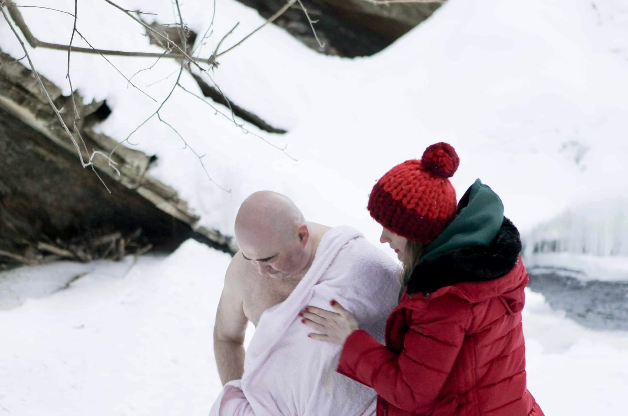 Известный ресторатор Максим Храмов опубликовал интересное фото, как он выходит из проруби, а на берегу его с полотенцем встречает журналистка Лала Тарапакина с полотенцем.