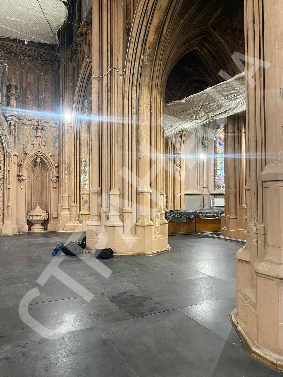 Корреспондент "Страны" побывал в восстановленном после пожара костеле. По его словам, изнутри он не производит впечатления полностью восстановленного - повсюду на стенах так и остаются следы копоти и очень отчетливо ощущается запах сажи.