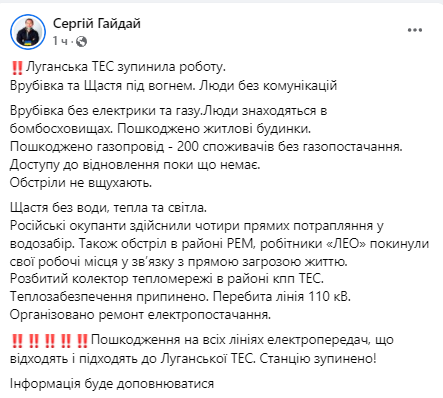 "Повреждение на всех линиях отходящих электропередач, подходящих к Луганской ТЭС в Счастье. Станция остановлена!" – сообщил Гайдай.