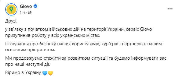 "В связи с началом военных действий на территории Украины сервис Glovo приостановил работу во всех украинских городах. Забота о безопасности наших пользователей, курьеров и партнеров является нашим основным приоритетом", - говорится в сообщении Glovo.