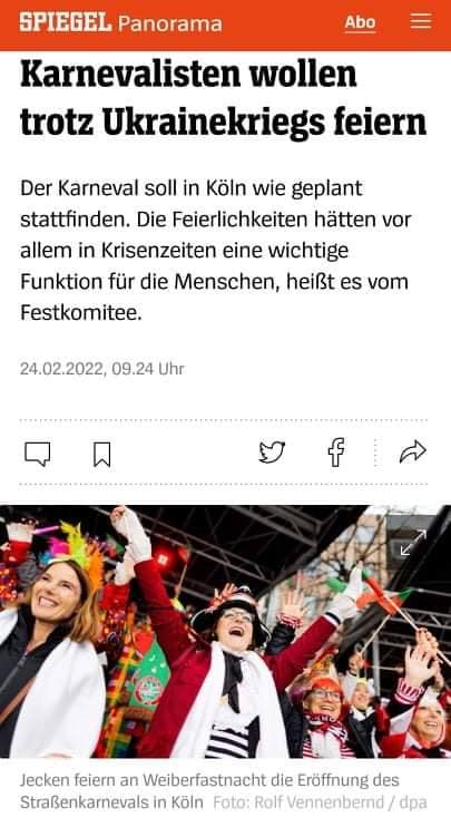 Оргкомитет Кёльнского карнавала решил не отменять его проведение из-за войны в Украине. Так как карнавалы, по мнению оргкомитета, "важны именно в кризисные времена". Об этом пишет Spiegel Panorama.