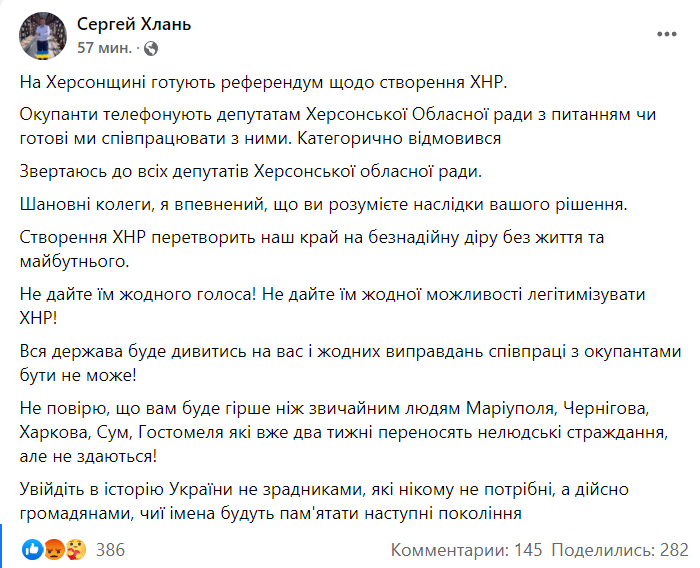 "Уважаемые коллеги, я уверен, что вы понимаете последствия вашего решения. Создание ХНР превратит наш край в безнадежную дыру без жизни и будущего. Не дайте им ни одного голоса! Не дайте им никакой возможности легитимизировать ХНР! Все государство будет смотреть на вас, и никаких оправданий сотрудничества с оккупантами быть не может!"