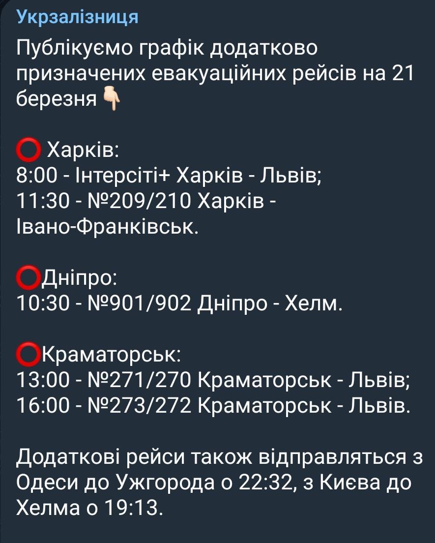10:31 Напоминаем график эвакуационных поездов из Киева, Харькова, Днепра и Краматорска на сегодня, 20 марта.