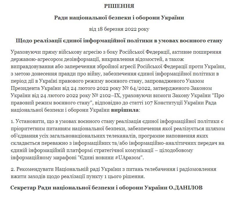 "Установить, что в условиях военного состояния реализация единой информационной политики является приоритетным вопросом нацбезопасности, обеспечение которой осуществляется путем объединения всех общенациональных телеканалов, программное наполнение которых состоит преимущественно из информационных и/или информационно-аналитических передач на единой информационной платформе стратегической коммуникации – круглосуточном информационном марафоне "Єдині новини #UАразом", - говорится в решении СНБО.