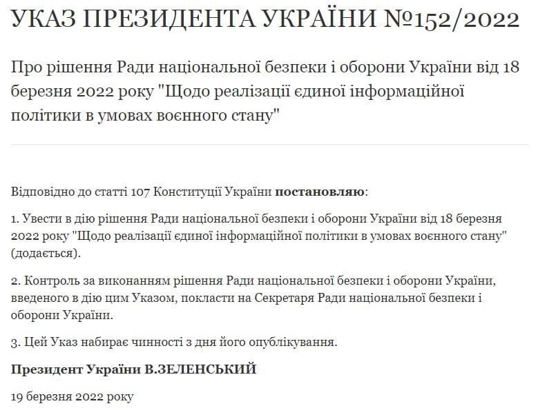 Напомним, президент Украины Владимир Зеленский подписал указ №152 о единой информационной политике в условиях вторжения России.