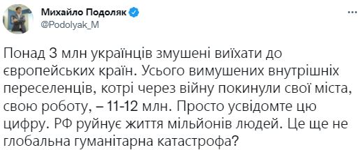 10.47 Более 3 млн украинцев вынуждены уехать в европейские страны. Всего вынужденных внутренних переселенцев, которые из-за войны покинули свои города и свою работу – 11-12 млн, написал Михаил Подоляк.