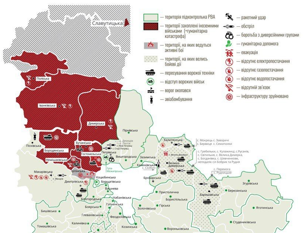 Вот карта Киевской областной военно-гражданской администрации за 22-е марта. По ней видно, какие территории удерживаются противником. Сильные бои идут в Ирпене, который на 80% удерживается за ВСУ, как сообщил мэр города Александр Маркушин.