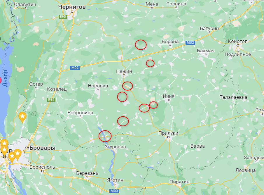 К востоку от Киева и Броваров, на территории Черниговской области, противник поставил блок-посты вблизи населенных пунктов Новый Быков, Лосиновка, Большая Дорога, Монастырище, Берестовец, Прохоры, Талалаевка, Макеевка.