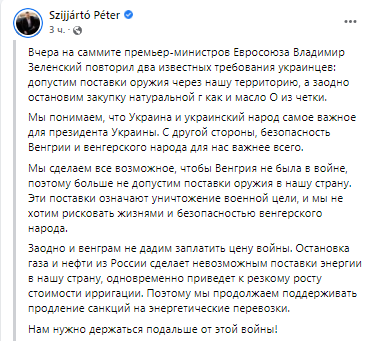 "Мы понимаем, что для президента Украины Украина и украинский народ важнее всего. Однако для нас важнее всего безопасность Венгрии и венгерского народа. Мы действуем, чтобы удержать Венгрию от войны, поэтому мы не допустим поставки оружия через нашу территорию. Эти поставки сразу станут военной целью для уничтожения, и мы не готовы подвергать риску жизнь и безопасность венгров", - написал Сийярто.