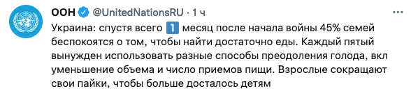 "Спустя всего 1 месяц после начала войны 45% семей беспокоятся о том, чтобы найти достаточно еды. Каждый пятый вынужден использовать разные способы преодоления голода, включая уменьшение объема и число приемов пищи", - говорится в сообщении.