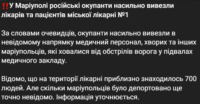 "В Мариуполе российские оккупанты насильно вывезли врачей и пациентов городской больницы №1. По словам очевидцев, оккупанты насильно вывезли в неизвестном направлении медицинский персонал, больных и других мариупольцев, скрывавшихся от обстрелов врага в подвалах медицинского учреждения", - указано в сообщении.
