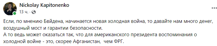 "Если, по мнению Байдена, начинается новая холодная война, то давайте нам много денег, воздушный мост и гарантии безопасности.