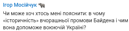 "Может ли кто-нибудь мне объяснить: в чем "историчность" вчерашней речи Байдена и чем она поможет воюющей Украине?" - задается вопросом экс-нардеп Игорь Мосийчук.