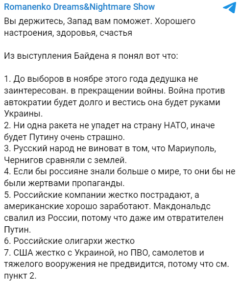 "Речь Байдена – очень слабая. Если бы он деловито и спокойно перечислил вооружения, которые через пару дней получит Украина, – это было бы дело. А так – вода и пустота.