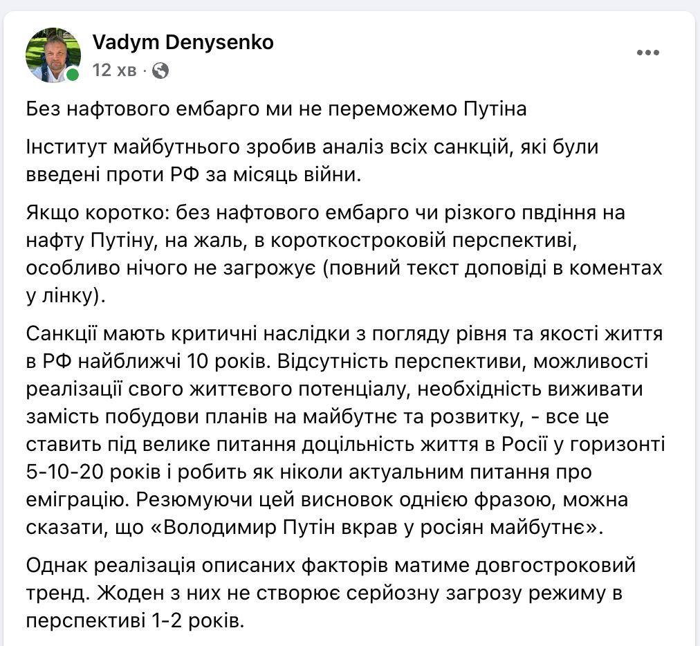Такой вывод содержится в анализе Украинского института будущего, который в Facebook опебликовал глава Института, советник главы МВД Вадим Денисенко.