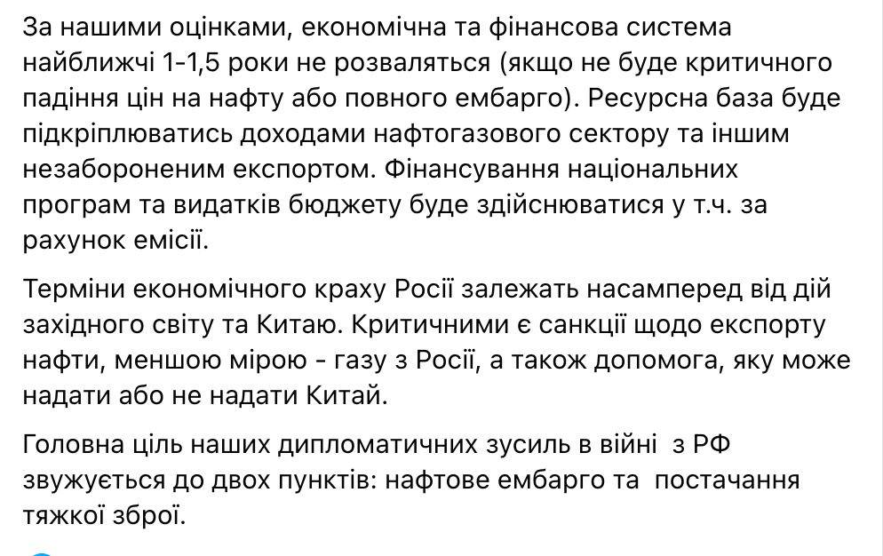 Институт делает вывод, что критическое значение для экономики РФ может иметь лишь введение эмбарго на импорт российской нефти (в меньшей степени газа), а также позиция Китая - насколько он будет помогать России компенсировать потери.