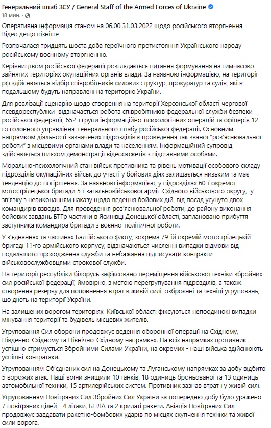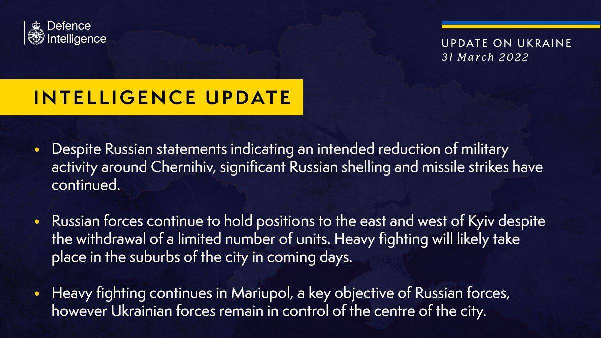 - Российские военные продолжают удерживать позиции к востоку и западу от Киева на фоне вывода некоторых подразделений. Британские военные ожидают, что на окраинах города в ближайшие дни могут начаться тяжелые бои