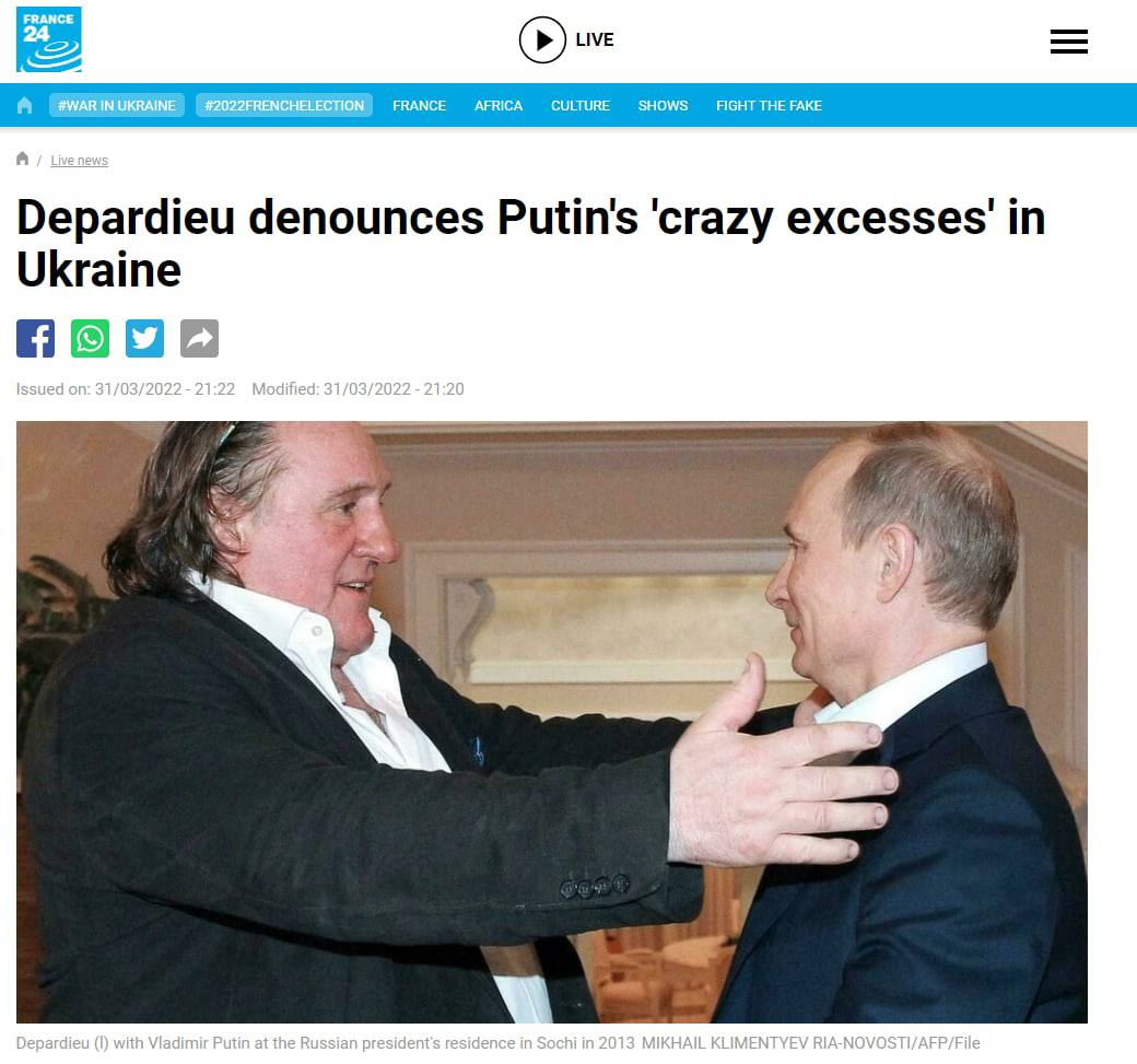 10.16 Актер Жерар Депардье в интервью AFP осудил "безумные, неприемлемые эксцессы" президента России Владимира Путина в Украине, но сказал, что российский народ не несёт за них ответственности.